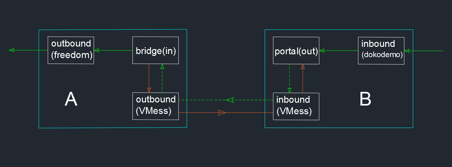 以上过程效果就相当于 C 向 A 发起请求,达到了访问 A 的私有网盘的目的。A 向 B 发起请求,A 需要一个 outbound ,B 需要一个 inbound(因为 A 的 outbound 是连接到 B 的 inbound,具备 inbound 和 outbound 的协议有 3 种:VMess, Shadowsocks 和 Socks。本节以 VMess 为例);C 向 B 发起请求,B 还需要一个 inbound,C 不运行 V2( B 的 inbound 要接受不是来自 V2 的流量,只能是任意门 dokodemo-door);因为是 A 来访问最终的服务器(私有网盘),所以 A 还需有一个 outbound,即 freedom。也就是说 A 需要两个 outbound(VMess 和 freedom),B 需要两个 inbound(VMess 和 dokodemo-door)。然后为了让 A 能够主动连接 B,A 需要配置反向代理(reverse);同样的,为了能够让 B 反向连接 A,B 也需要配置反向代理(reverse)。最后还要配置好路由。