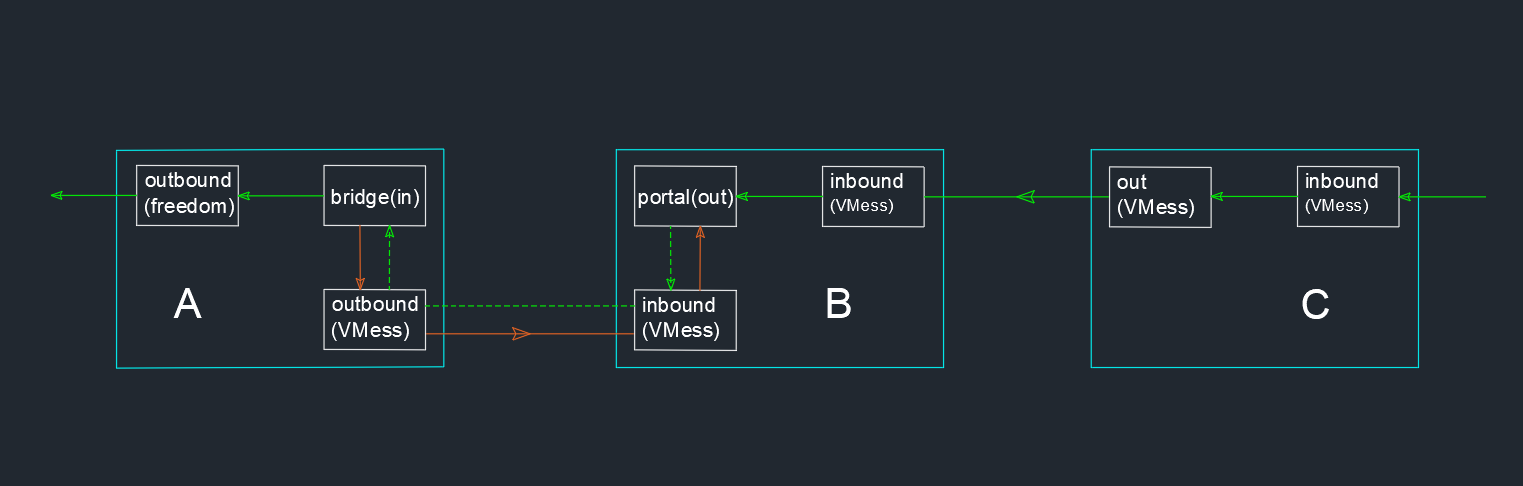 : 在 B 的配置中,可以使用同一个 VMess inbound 来接受 A 和 C 的请求来简化配置。