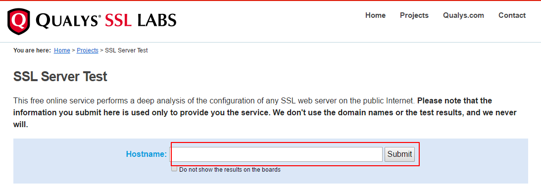Click Qualys SSL Labs's SSL Server Test (opens new window), then input your domain into Hostname; then click submit, after a while, you will able to see the result.
