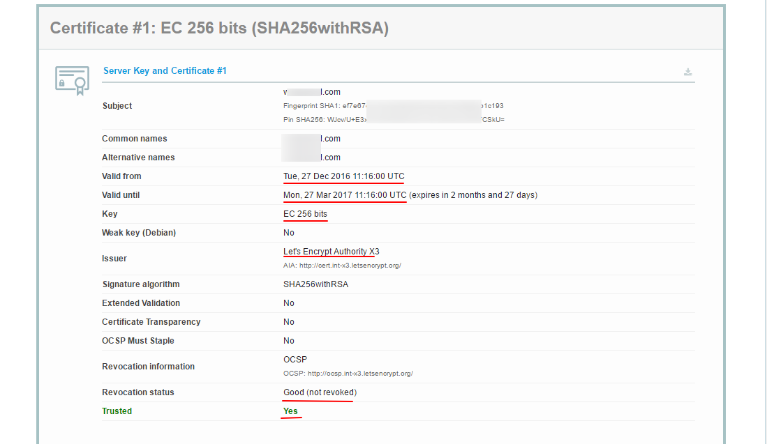 Here it is your certificate information. In this screenshot, we can see it is valid through Dec 27, 2016, to Mar 27, 2017, and the encryption method used is 256-bit ECC certificate, which is signed by Let's Encrypt. Most importantly,
